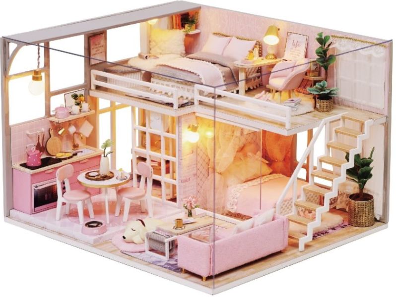 An incredibly delicate composition that will attract the attention of every girl. She will perfectly fit into the game with dolls, because there is everything you need for this. The two-story house, made entirely in pink, looks great when assembled. At night, you can turn on miniature floor lamps in it and from an ordinary dollhouse everything will turn into a magical little corner in the children's room, which everyone will definitely want to look into.