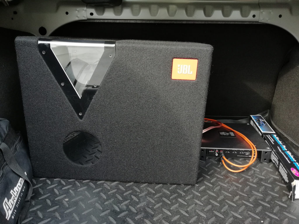 Stylish sound device in a closed aluminum box. A feature of the device is its size - it takes up little space and can be easily placed in the spare wheel well.