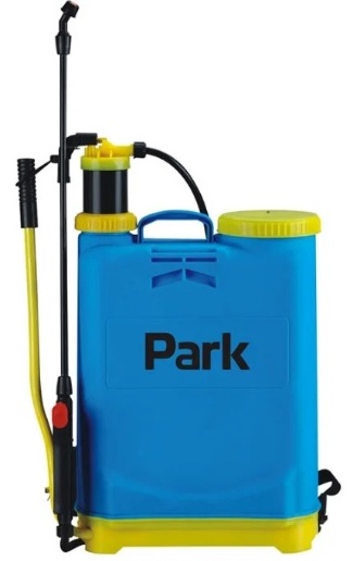A backpack-type sprayer, complete with a pump, a hose, two additional nozzles and a sprinkler. Construction material - plastic, color - gray + yellow, harnesses - cloth. Wide base, allows the device to be placed on a flat surface. There is a measuring scale on the body, there is a continuous irrigation lock and a safety valve.