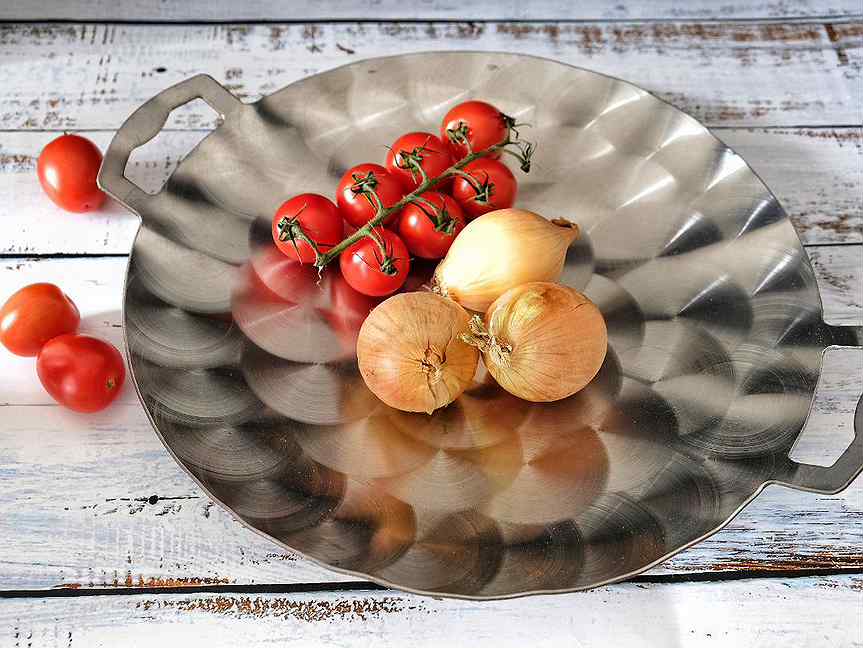A feature of this model is a flat thicket. Saj can be used for cooking on a fire, as well as for grilling. Often vegetables and meat sausages are fried on such a product. Made of high quality steel that warms up evenly. The food is cooked in its own juice without sticking to the surface of the pan.