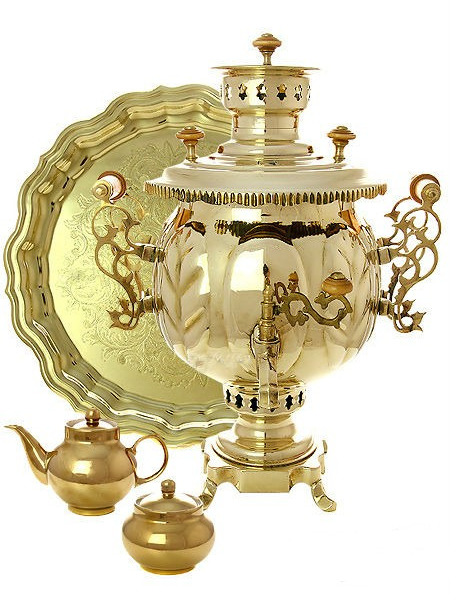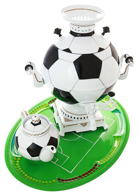A very interesting proposal for the consumer market came from a Tula manufacturer. Its exclusive design solution will not leave any lover of football and strong aromatic tea aside. The presented set consists of a round samovar, decorated in the form of a soccer ball, a teapot and a metal tray. Such a set is able to decorate even the most ordinary tea party. The parts made of high quality brass by cold stamping ensure structural strength and preservation of the liquid inside the body in a hot state for a long time. The inner side of the kit is processed with food-grade tin, which allows you not to worry about the harm of the coating on the human body. A high-quality heat-resistant varnish coating creates a stable barrier against possible contamination of the surface of products. A volume of 5 liters allows you to treat a company of 5-10 people with fragrant tea. Depending on the wishes of customers, the shape of the tray can be rectangular, oval or round.