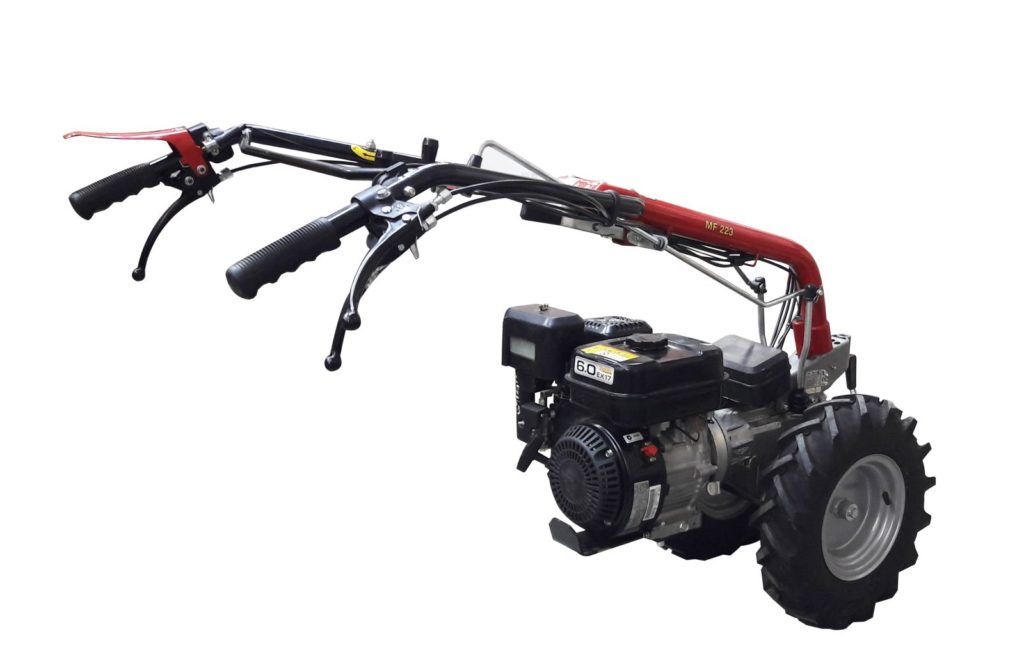 The mower has performed well in areas with very thick or tall grass. Its high performance is ensured by a powerful motor, as well as a special knife unit with high quality blades that move oppositely. This reduces vibration and improves working comfort. The agricultural machine wheels, which adhere tightly to all types of ground, do not slip on mud or slopes and do not leave a deep mark.