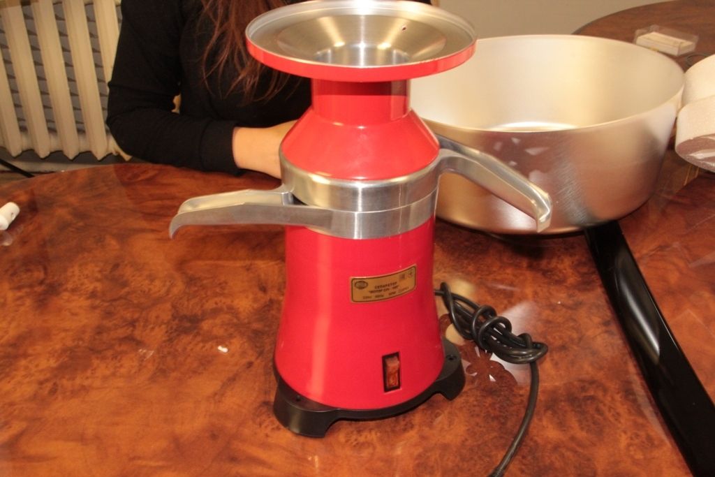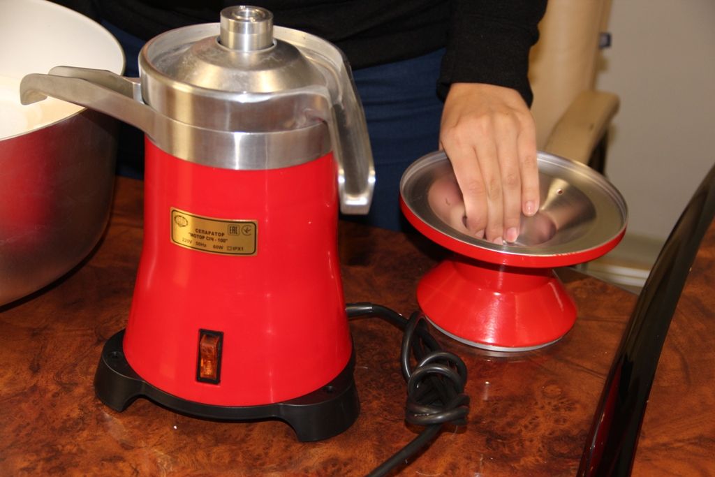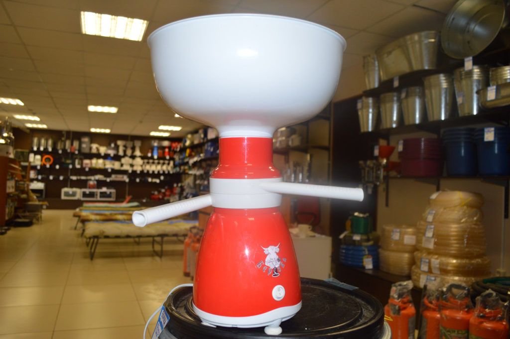 The cage body is finished in red. A cow's head is shown next to the power button, and there is also a sensor for regulating the fat content of products at the outlet. In the process of separating milk, the unit simultaneously filters and disinfects milk. The parts are made of heat-resistant plastic, thanks to which dairy products do not acquire an unpleasant odor.