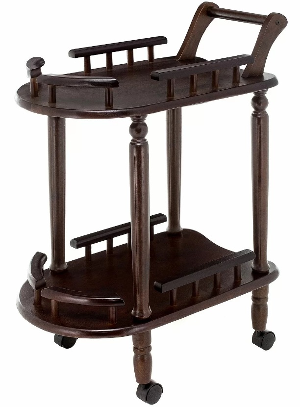 Serving table on oval wheels, made of solid wood in a classic style. Curly legs. A handle on one side is provided for easy transport. The tabletops from the manager's side have a straight rounded cut, which prevents the appearance of chips. The edges of the working surface are equipped with small sides on three sides: vertical cylinders, on top of which a horizontal beam is placed.