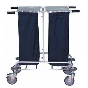 Welded structure made of steel pipes of circular cross-section with a special coating (environmentally friendly product, polymer powder). The wheels rotate spontaneously, two of them are equipped with a brake system. Plastic bags for linen are easy to change, placed in special covers with thick fabric. Everything is covered from above with aluminum lids.