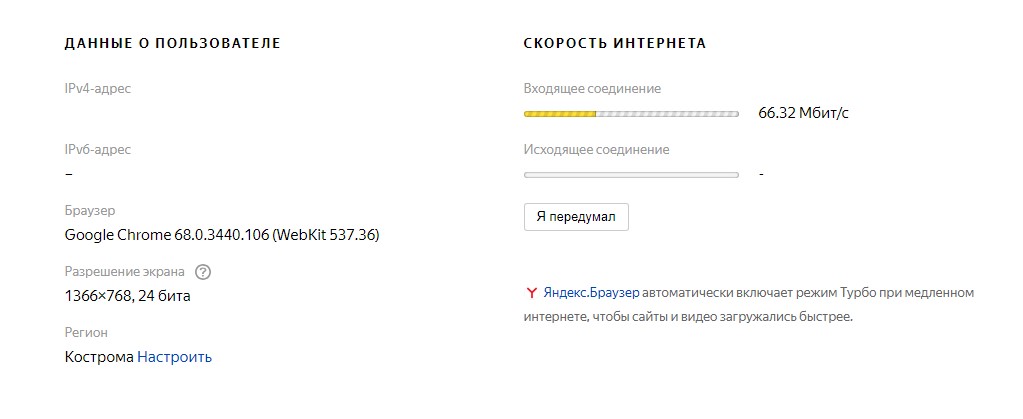 Service from Yandex with minimal functionality. After verification, the user receives the results of the incoming and outgoing connection, as well as detailed technical information about the browser.