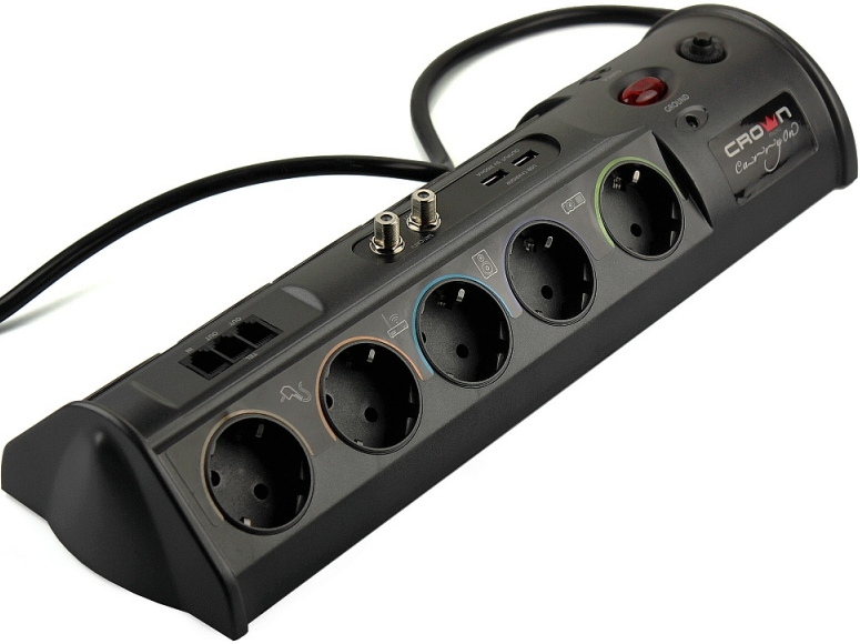 The design has 5 USB connectors of 2.5 A. There is a fast charging function, so you can simultaneously charge several mobile gadgets. An additional option in the filter is protection against excessive charging, overheating and high voltage surges. The product weighs 960 grams and the cable length is 1.6 meters.