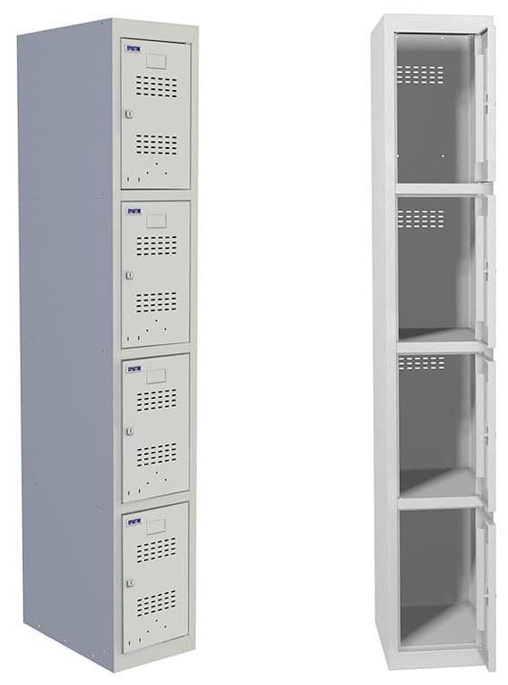 A side cabinet is a dressing room without a side wall. It is an added sectional element and is used in conjunction with a solid piece of furniture. Four-door version with installation in a single section. The best sample made by Russian craftsmen, which is made for storing changeable work clothes in workshops and storerooms, sports facilities and similar premises. Quite reliable quality with excellent depth, different from similar examples.