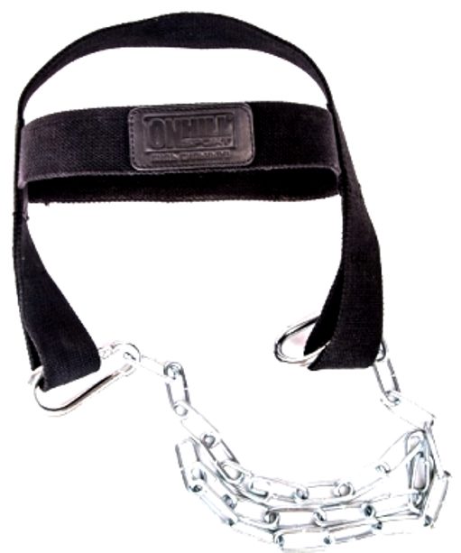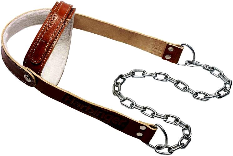 The model of the Pakistani manufacturer is made of genuine leather. The inner part is fleecy, excellently absorbs moisture; at the intersection of the belts, a hinge device is provided for their connection. The set includes a chain with a carabiner and two steel half rings. It is used for direct pumping of the cervical muscles with additional weights.