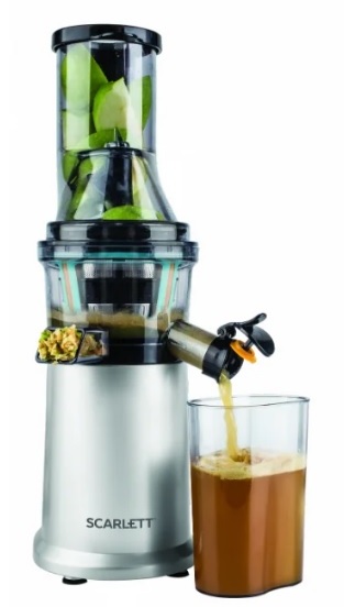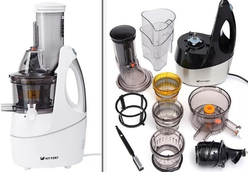 The principle of operation of the kitchen mechanism is as follows: fruits are placed in a container for loading, ground, and with the help of a shaft, they are squeezed out through a sieve. Then there is the separation of juice and cake in different containers. The shape of the bowl and auger affects how fast the process of squeezing out the drink will be.