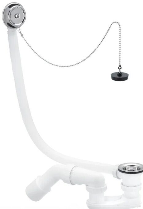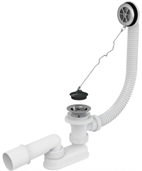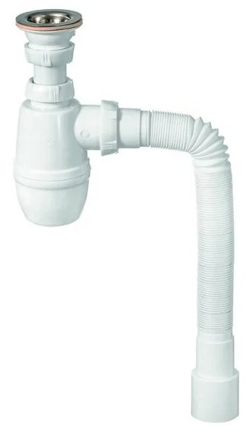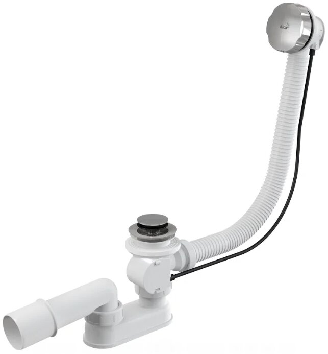 Manufactured by AlcaPLAST (Czech Republic). Siphon design: pipe (knee). Material - white plastic (polypropylene), stainless steel (chrome plated). The set additionally contains a grate, plug, drain and overflow, corrugated hose.