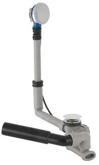 Manufacturer - Viega (Germany). Material - plastic, stainless steel. Bath drain hole diameter: 52. Drain elbow 45⁰.