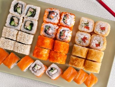 You can try sushi, rolls, desserts, pizzas, soups, salads, kebabs, assorted drinks.