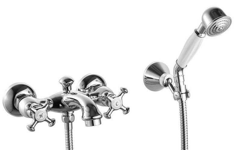 Antique styled two-valve bath mixer with shower. The robust and reliable cast spout is equipped with the Neoperl M28 aerator. The valves can be rotated 180 degrees, which allows precise adjustment of the water temperature.