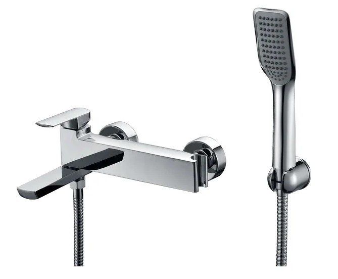 The faucet is designed in a modern style with a predominance of rectangular shapes. The watering can holder is located on the mixer, but a wall-mounted one is also included. An unusual way to switch bath-shower: the switch is a spout, which either hides under the mixer and then the shower turns on, or turns into the bath.