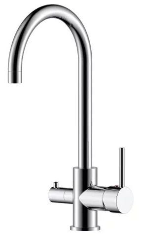 Mixer with C-shaped spout and the ability to connect a filter for drinking water. The self-cleaning aerator has two outlets: in the center - for drinking water, around the circumference - for tap water. The design of this model involves the connection of a push-down bottom valve if necessary. The smooth movement of the handle allows you to precisely adjust the water temperature and pressure.