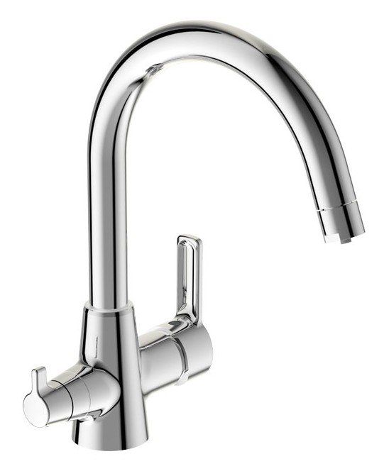 Mixer with the function of switching to filtered drinking water. The high C-shaped spout is easy to use. The package includes a plastic aerator, which is equipped with an easy cleaning option.