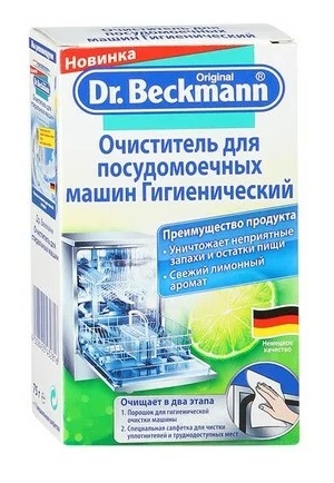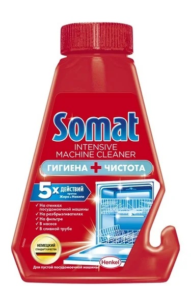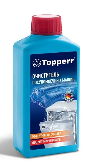 The German company Henkel has proven itself well, so comments are unnecessary. The tool effectively cleans the insides of the PMM from fat and scale. The liquid is supplied in the usual packaging with a hook for easy hanging from the basket.