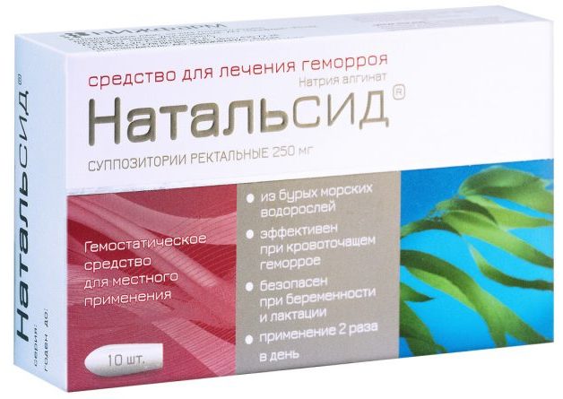 The main component of candles is sodium alginate. This component stops bleeding, fights inflammation and makes the process of tissue repair shorter in time. Natalsid fights the symptoms of diseases of the anus and rectum. The main structural components of sodium alginate are responsible for the effective treatment of symptomatic manifestations of the disease: hyaluronic and alginic acids. Under the influence of hyaluronic acid, healthy cells divide faster, which contributes to the rapid healing of wounds and cracks.Alginic acid, once in the rectum, envelops the affected walls and relieves pain. Also, the use of suppositories brings a positive result for bleeding from the anus. The package contains 10 suppositories.