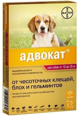 This product is universal, it is declared as a remedy for fleas, ticks and worms. Contains imidacloprid and moxidectin, these substances paralyze parasites and lead to their death. It will need to be applied to dry skin at the withers so that the dog does not reach and begin to lick this place. If a rather large dog, then it is recommended to apply in two more places.