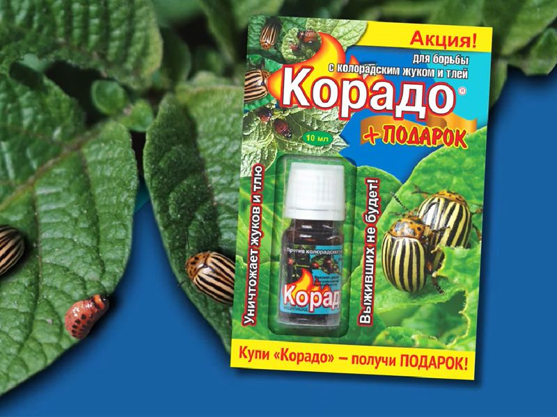 Means "Corado" is designed to combat the Colorado potato beetle and aphids. It is sold in a small bottle, which is packed in a cardboard box.
