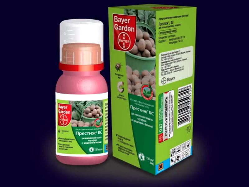 "Prestige" is a remedy for the Colorado potato beetle intended for processing tubers before planting. It is sold in a small 60 ml jar, which is packed in a cardboard box. An instruction is provided that details the use. In addition to eliminating pests, "Prestige" is designed to fight diseases (common scab, black leg, rhizoctonia, wet rot).