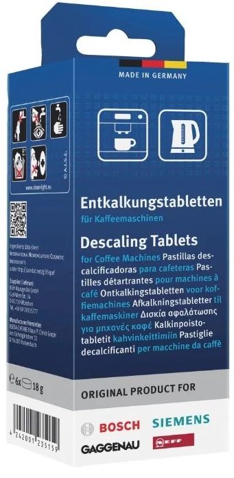 Decalcification product from Bosch. Available in tablet form for preparing a cleaning solution. The active ingredients are citric, malic, sulfamic acids. The package contains 6 tablets, which are enough for 3 cleanings.