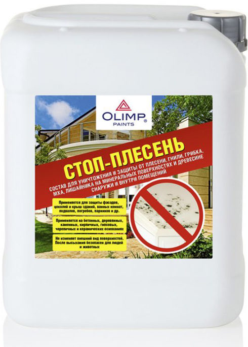 A product from a Russian manufacturer that creates long-term and reliable protection against fungal deposits. It has a wide range of applications, can be used in wet rooms: bathrooms, showers, saunas, swimming pools, as well as basements, basements and attics, facades and roofs of buildings. With the help of "Olympus Stop Mold" you can remove fungus from concrete, tile, natural stone, brick, wood and plaster. At the same time, the drug is harmless to humans and pets, since the composition does not contain chlorine or harmful volatile substances. Also, it does not change the color and texture of the treated surfaces.