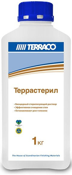 Highly effective Russian biocidal agent for external and internal treatment of premises. It successfully copes with various types of mold, fungus, moss, lichen and algae. The preparation contains active fungicides that have a disinfecting effect and prevent the re-formation of fungal plaque. At the same time, "Terrasterill" does not contain harmful chemical compounds, solvents - it is an ecological water-based solution. It has good penetrating ability, and is also able to strengthen and level the surface, increasing its moisture-proof properties. The antiseptic not only does not spoil the appearance of the material, but also evens out its color, in addition, the solution can be tinted in a shade similar to the shade of the treated coating. Another significant advantage of Terrasterill is its drying time of only 18 hours. The solution is suitable for disinfecting concrete, plaster, brick, minerals and painted surfaces.