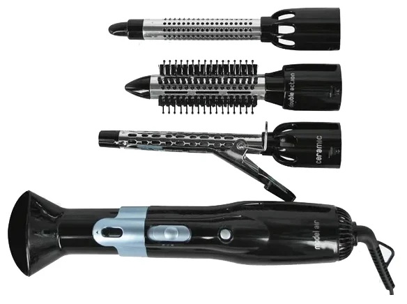 It costs 2900 rubles. There is a power indicator, the cord rotates, a loop for hanging. There are seven nozzles, ceramic coating. The set includes a brush, curling iron, corrugation, spiral styling, straightening.