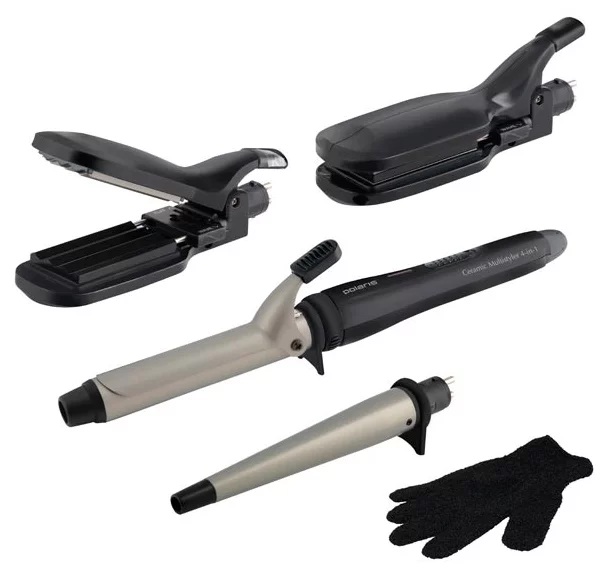 Price: 3499 rub. The 50 W multi-styler with conical pliers heats up to 200 degrees. The indication of inclusion is present, there is a loop for hanging. The device is protected from overheating, the cord rotates. In addition to the conical, 13-25 mm nozzle, you can attach a 25 mm curling nozzle, 35x70 mm for straightening, the same corrugation. Includes a protective glove. Ceramic coating.