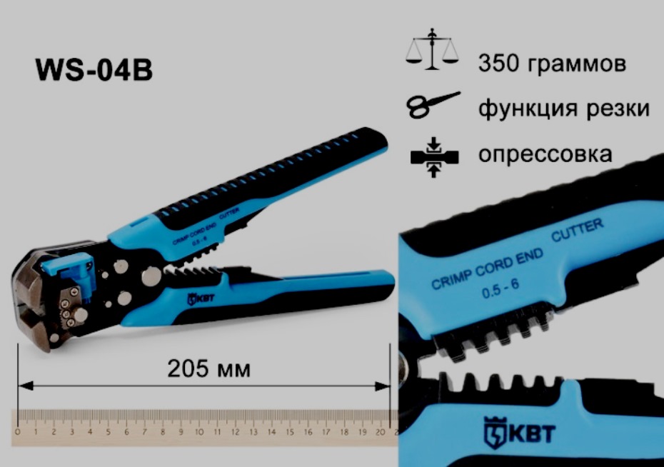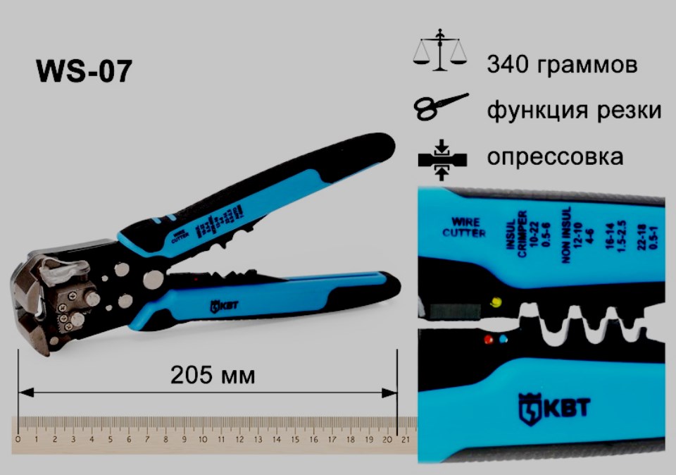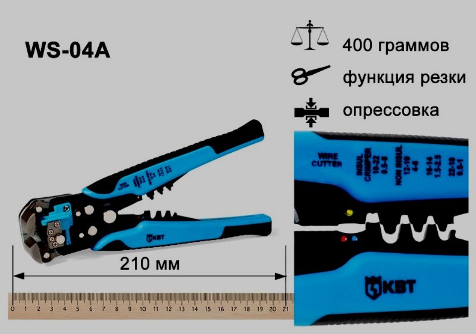Working range 0.5-10 mm2. Able to work with tips (for crimping) NSHV and NSHVI. Removal of old material from flat-type wires (PUNP, VVG-P) is allowed. There are no complaints about the work of the device. Numerous positive reviews on the network speak in favor of buying such a device. The knives are not very well placed. The lever is not convenient to use, as it has small dimensions.