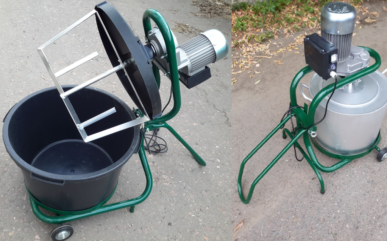 The design versatility lies in the fact that it can be installed on a container with a volume of 1 to 90 liters. For this, the geared motor is equipped with 4 bolts for fastening to various kinds of attachments. But it is usually produced installed on ready-made containers made of aluminum, stainless steel, tin or plastic. Most often in a volume of 40 liters, 65 liters, 90 liters.