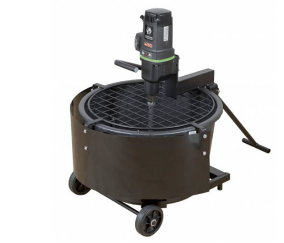 The mixing container is 50 liters. One removable spindle is installed on the motor shaft through a chuck. The dimensions of the device are: 940 mm × 580 mm × 780 mm. For ease of movement of the device during operation, 2 small wheels are fixed on the frame. A special convenient folding T-shaped handle is used to lift the cover with an electric motor and move the device.