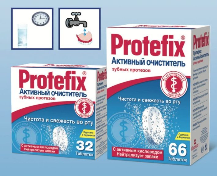 Protefix tablets have proven their effectiveness in such a matter as cleaning the prosthesis from the remnants of food stuck between the teeth, which is dangerous for the enamel of microbial plaque and calculus. If the artificial teeth have darkened from nicotine, strong black tea or coffee, wonderful pills will help restore the original color. In addition to the fresh breath that comes from the pills, the denture will be covered with a protective film and saved from damage that may occur during cleaning.
