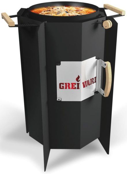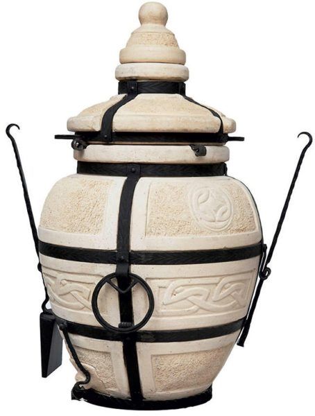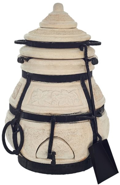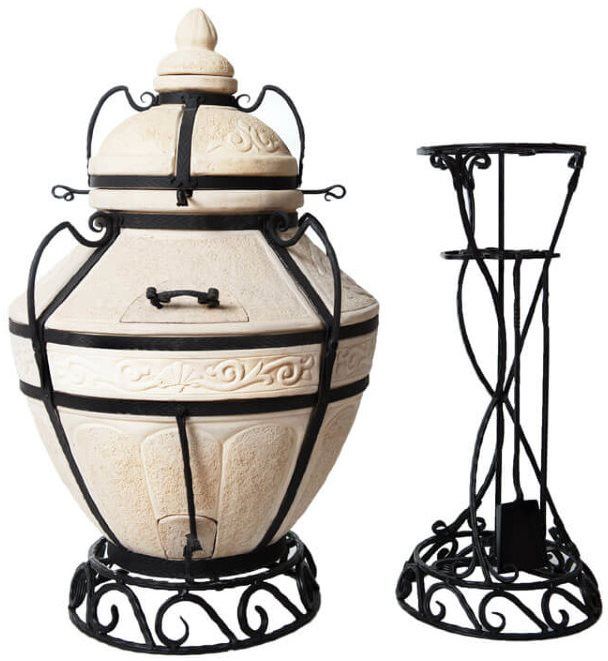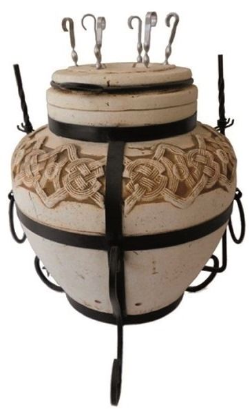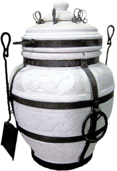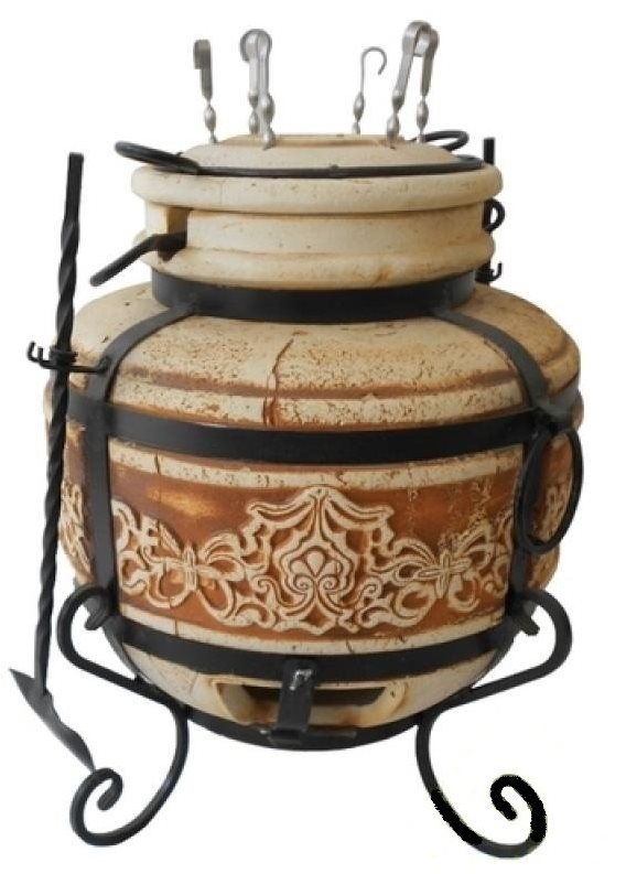 The chamotte clay jug design evenly distributes heat inside. The forged frame protects the walls from cracks and mechanical damage. Fish, meat, shish kebab, vegetables - any dish will turn out faster than on a fire or grill. The wall thickness of 5 mm will provide long-term heat without additional ignition. Together with the oven, the buyer will receive a set of forged skewers, a grate, a poker and a scoop for cleaning. The rest of the accessories will have to be purchased separately if desired. The price tag for the model ranges from 8 to 9 thousand rubles.