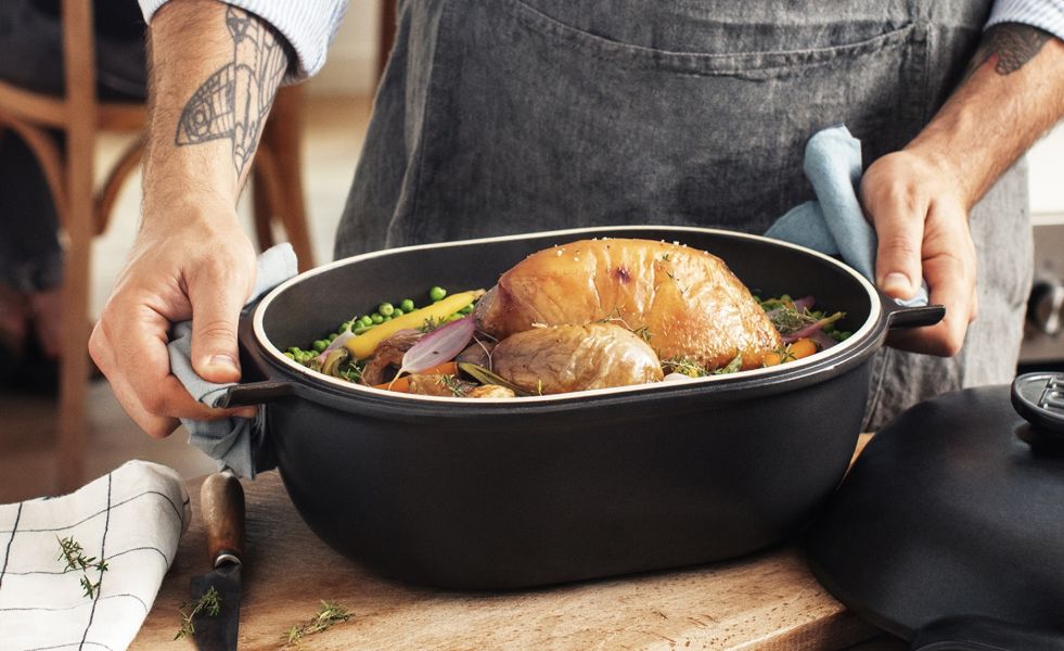 Cast iron containers with ceramic lids are the perfect combination for juicy roasting and braising.