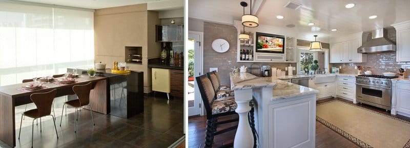 As a rule, when choosing a TV in a bedroom or living room, we are guided by the generally accepted opinion “the more the better”. As for the kitchen area, the issues of compactness and ease of placement are more relevant here. The TV in the kitchen should be in a comfortable area in order to watch it from different parts of the kitchen. At the same time, he should not be in the usable space of the room, while limiting the work of the hostess or the movement of households.