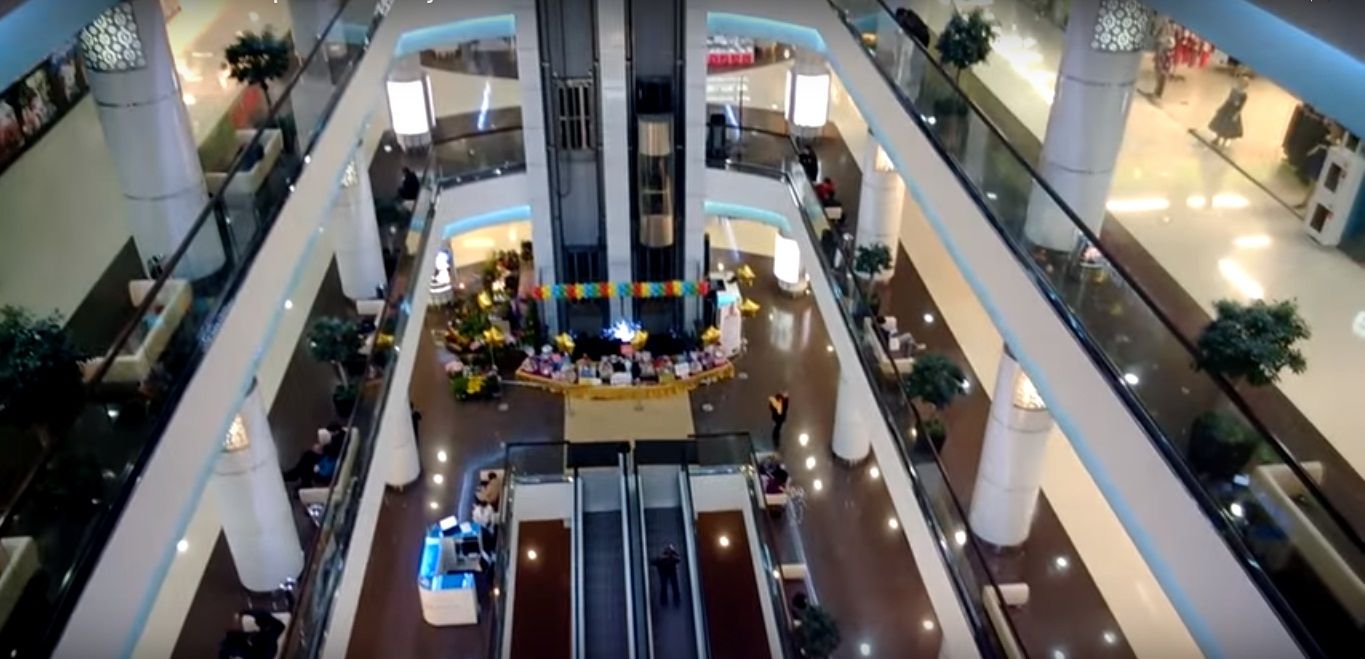 The aura occupies a huge area, which includes not only space for shops, entertainment centers and fast food, but also a landscaped area with green spaces and benches for relaxation.