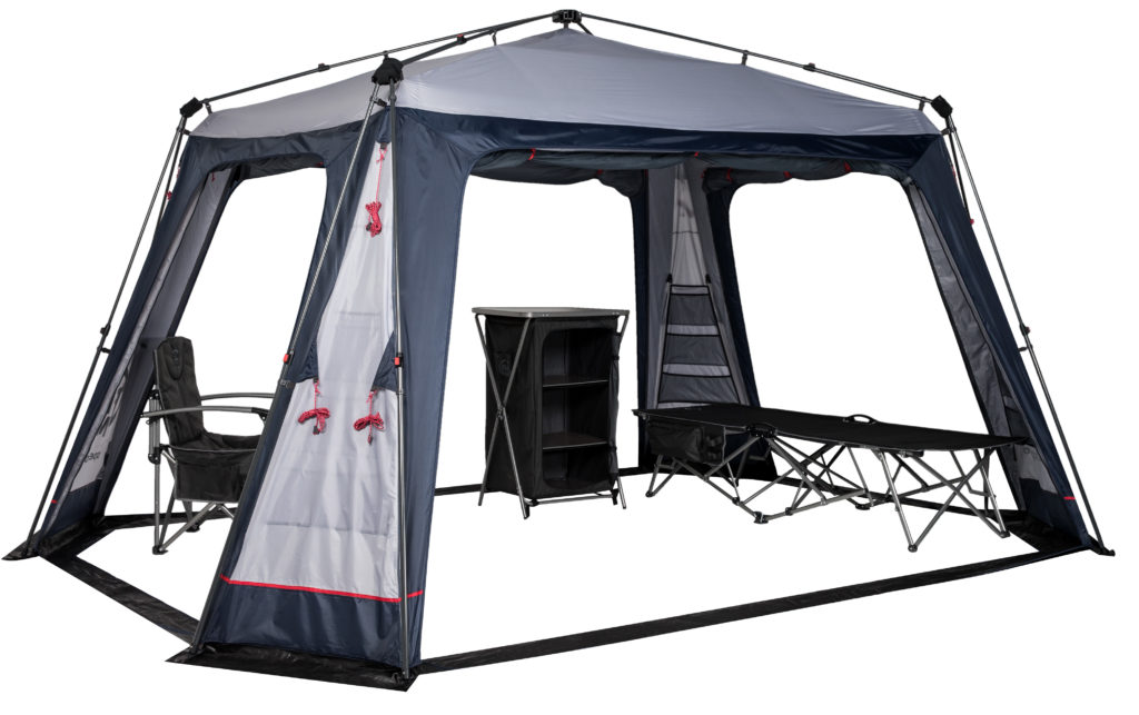 The tent provides a large number of new possibilities. The uprights allow you to expose a sun shade and even allow you to put the car inside.The system boasts upgraded ventilation, which is covered with an additional cape on top, which gives additional rigidity. So, Lego can withstand even the strongest winds. In addition to the tent, you can purchase a floor that allows you to spend the night in comfort. A tent house can also be added to significantly expand the existing space.
