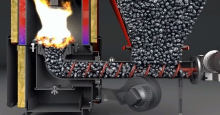 A rotating retort burner is installed, the fuel does not sinter due to mixing. The reverse smoke draft into the bunker is excluded by the anti-smoke system by creating a vacuum in the tube between the bunker and the firebox.