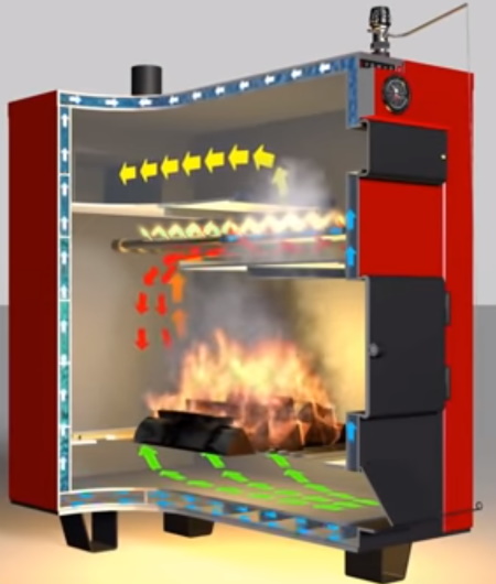 2. As the combustion progresses, the temperature in the furnace increases to 1000 ° -1300 °, and the heating of the coolant - water, reaches an operating value of no more than 95 °, which is maintained by regulating the air supply valve to the combustion chamber.