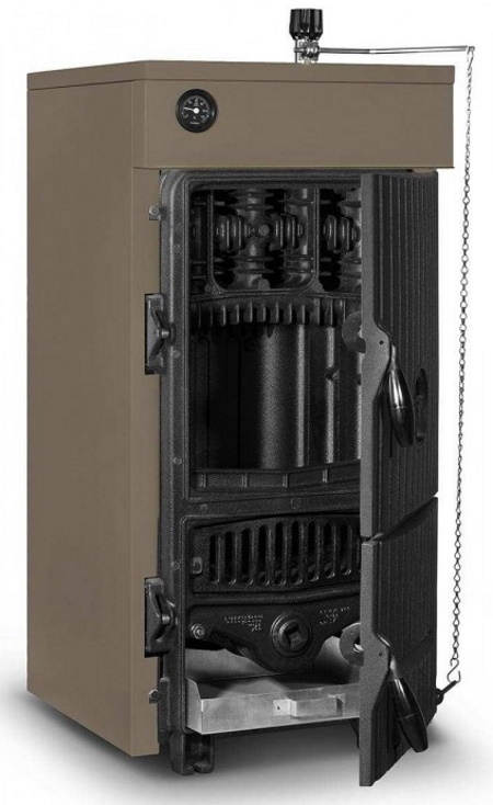 Compact product for heating up to 140 m2 of floor space, as well as summer cottages or garage. After burning coal or wood, the boiler maintains the required temperature. Uniform distribution of air flow in the furnace is ensured by using a cast iron grate.