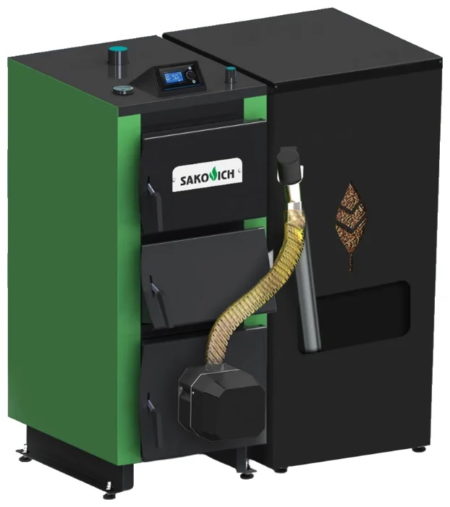 Universal model with automatic burner for all materials. One module of the structure includes a large sealed hopper for operation of one load for a week. You can install a level sensor, which will signal online about the need for refueling. The hopper is located to the right or left of the boiler at the user's request.