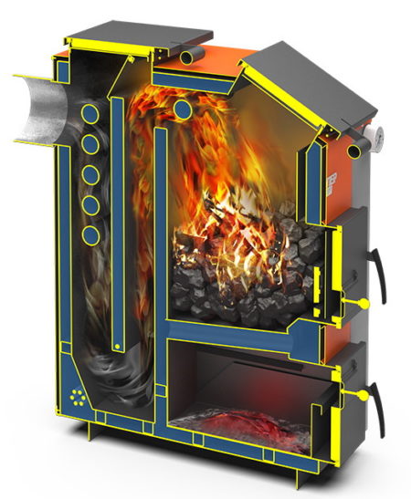 2. Pyrolysis - are distinguished by the use of the principle of separate combustion of materials and gases generated during combustion. Heat is generated in large quantities when mixed with the supplied oxygen. Waste in the form of ash and soot is practically not formed, and the efficiency of the device is very high. It is imperative to comply with increased requirements for the moisture content of firewood, which should not exceed 15 percent.