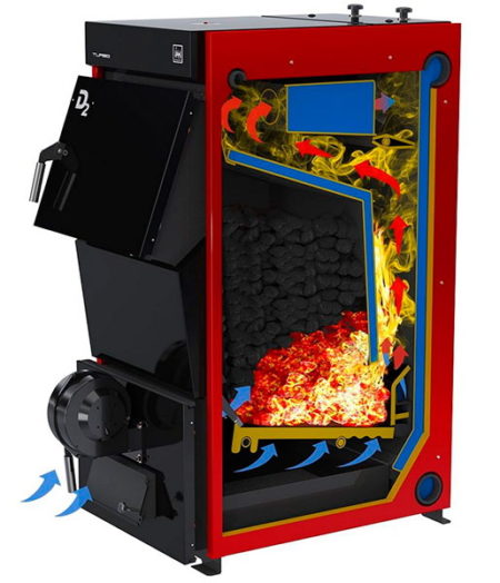 An effective product for heating residential buildings or outbuildings up to 200 sq.m. The use of the pyrolysis method provides for the generation of heat both by burning the load and using the produced gas.