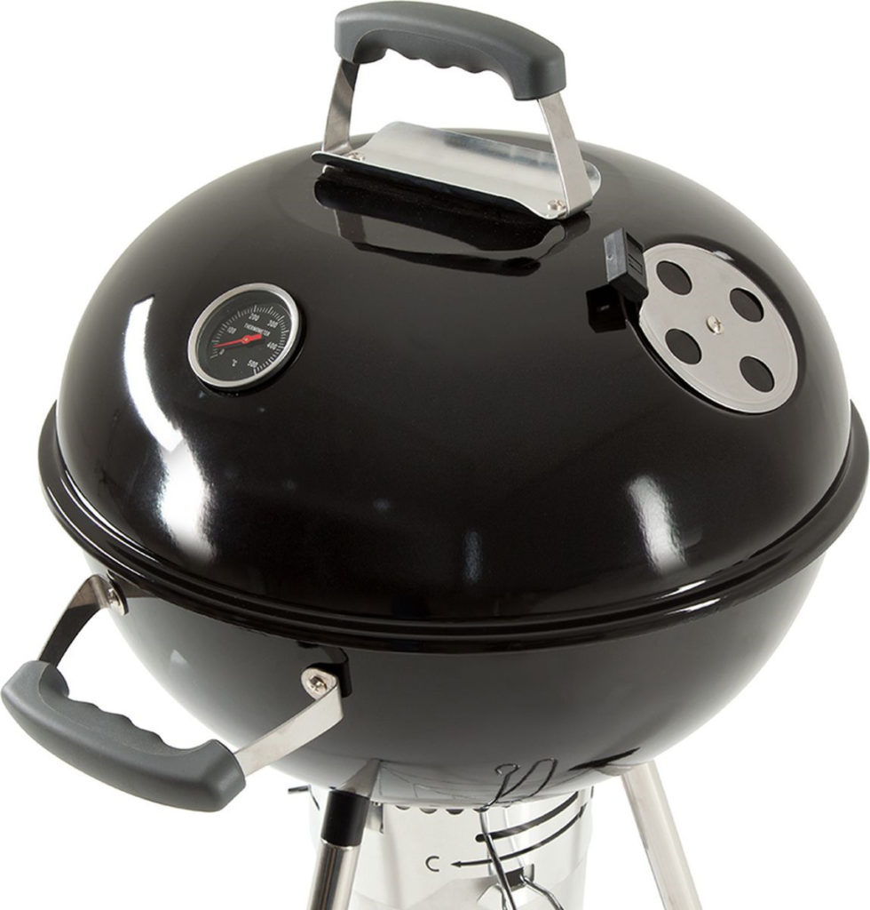 One of the most popular models for a summer cottage. The compact size allows you to transport the device to nature. Convenient lid closes tightly. Therefore, food is prepared quickly. The appliance has two cooking grates. A built-in thermometer keeps track of the temperature. With the help of the device, you can not only cook food, but also reheat it.