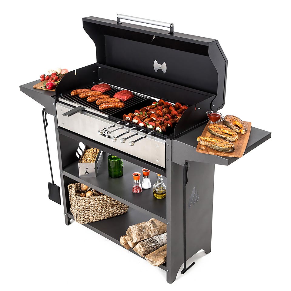 The charcoal grill is equipped with an automatic ignition system. Made from stainless steel. You can adjust the temperature yourself, for this there is a thermometer on the case. Nearby there is a convenient table that can be used for cutting meat.
