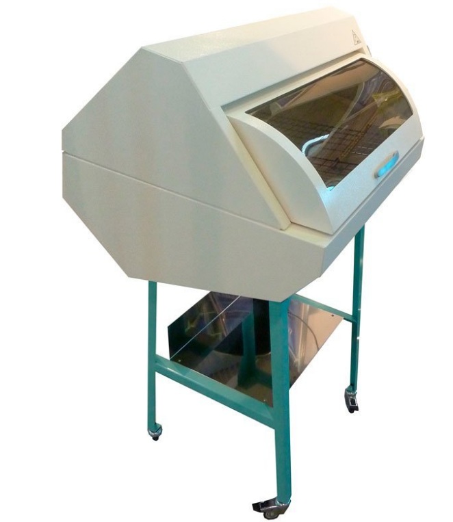 Description of appearance: a body with a hingedly rising and falling transparent cover, installed glass safe for humans, a metal mesh for storing tools, a stand on movable supports and a shelf with one small side.