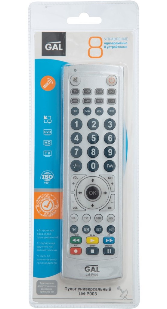 The multifunctional remote control can simultaneously control 3 devices. Backlit buttons allow you to operate comfortably in the dark. Working range up to 15 meters, provided that there are no obstacles. It can be synchronized with devices of Russian and Chinese manufacturers.